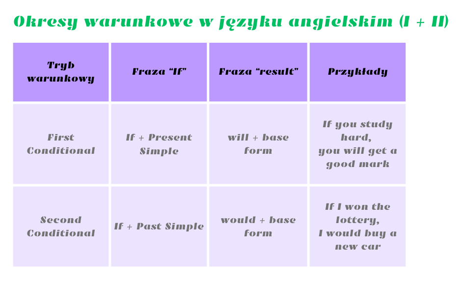 W przypadku pierwszego okresu warunkowego (First conditional) oraz drugiego okresu warunkowego (Second conditional) gramatycznie mamy do zapamiętania kilka prostych konstrukcji: